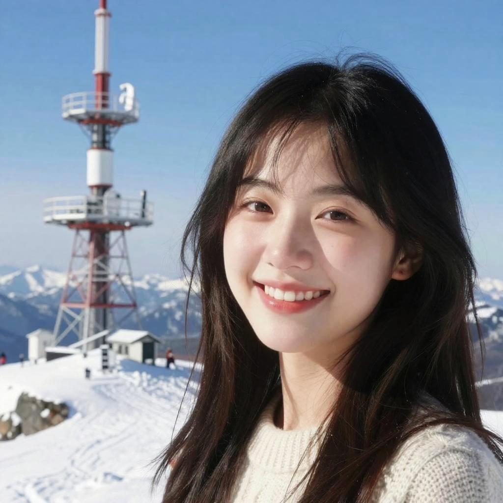 Photograph of a smiling East Asian woman with long black hair, wearing a white sweater, standing in snowy mountain landscape with a red and white radio tower