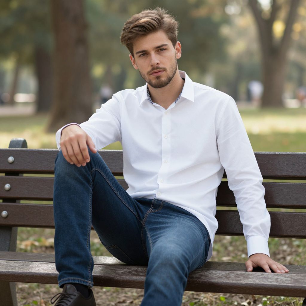 Photograph of a young Caucasian man with light brown hair, styled neatly, and a trimmed beard, sitting on a dark brown wooden bench in a park. He is wearing a crisp white button-up shirt and dark blue jeans, with black shoes. His right arm rests on the bench while his left hand is placed on his left knee. The background is softly blurred, featuring tall trees and a grassy area, with sunlight filtering through. The man has a serious, slightly pensive expression. The park setting gives a calm, natural ambiance.