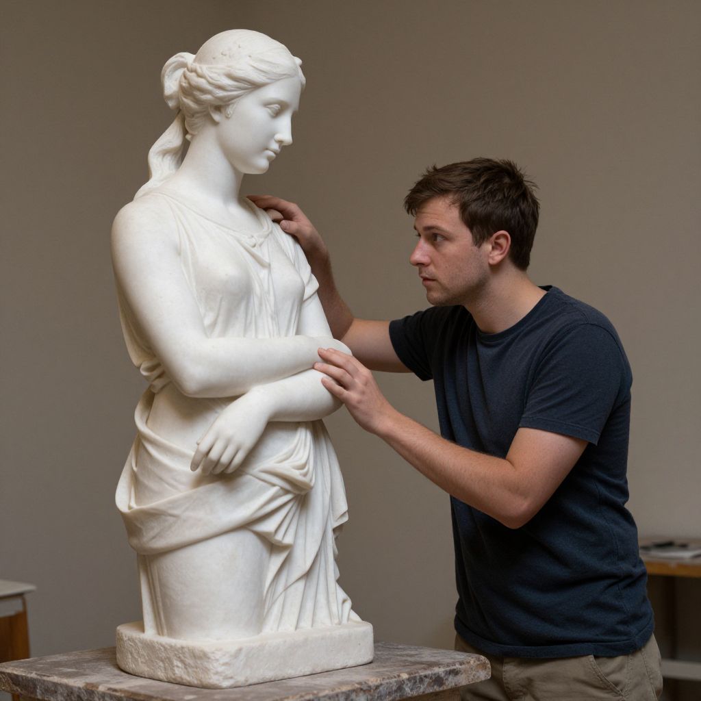 Photograph of a young Caucasian man with short brown hair, wearing a black t-shirt and beige pants, kneeling next to a white marble statue of a classical-style woman. The woman has a serene expression, with her hair tied in a bun and wearing a draped, flowing gown. The man is gently touching the statue's shoulder and arm, examining it closely. The background is a plain, beige wall, and the statue is placed on a round, marble-like pedestal. The image has a slightly high-contrast, vibrant quality.