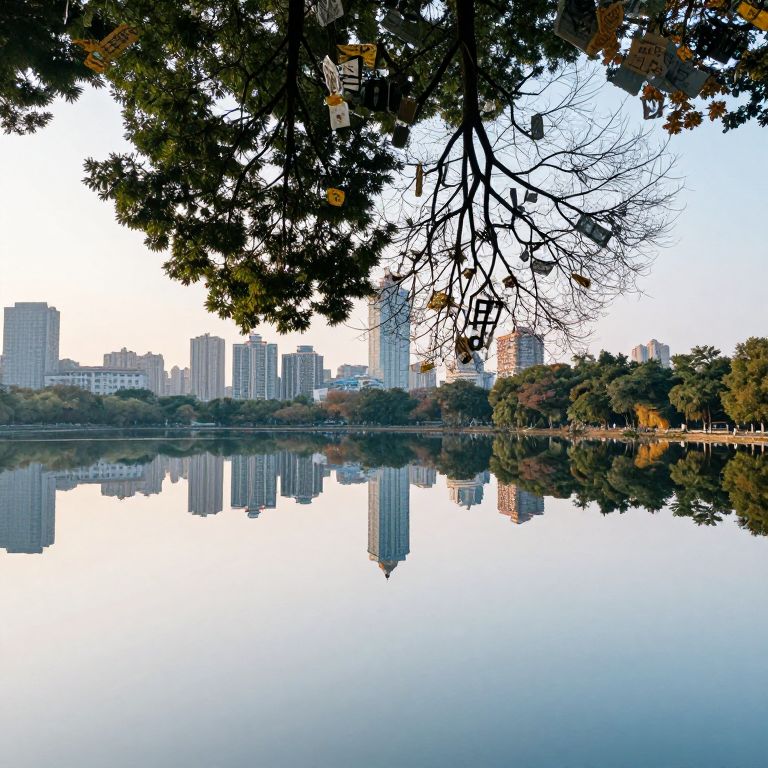 Photograph of a cityscape reflected in a calm lake. The foreground features dark, silhouetted tree branches with sparse leaves framing the top. The lake, mirror-like, perfectly reflects tall, white and beige skyscrapers and low, green trees along the shore. The sky is clear, with soft blue hues. The buildings, evenly spaced, create a symmetrical reflection. The image has a serene, peaceful quality, with the natural and urban elements harmoniously blended. The overall composition emphasizes symmetry and reflection.
