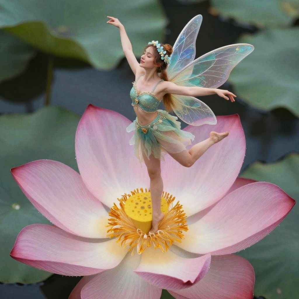 Realistic photo.fantasy painting by Lena Vargas of a fairy dancing on a flower petal realistic photo