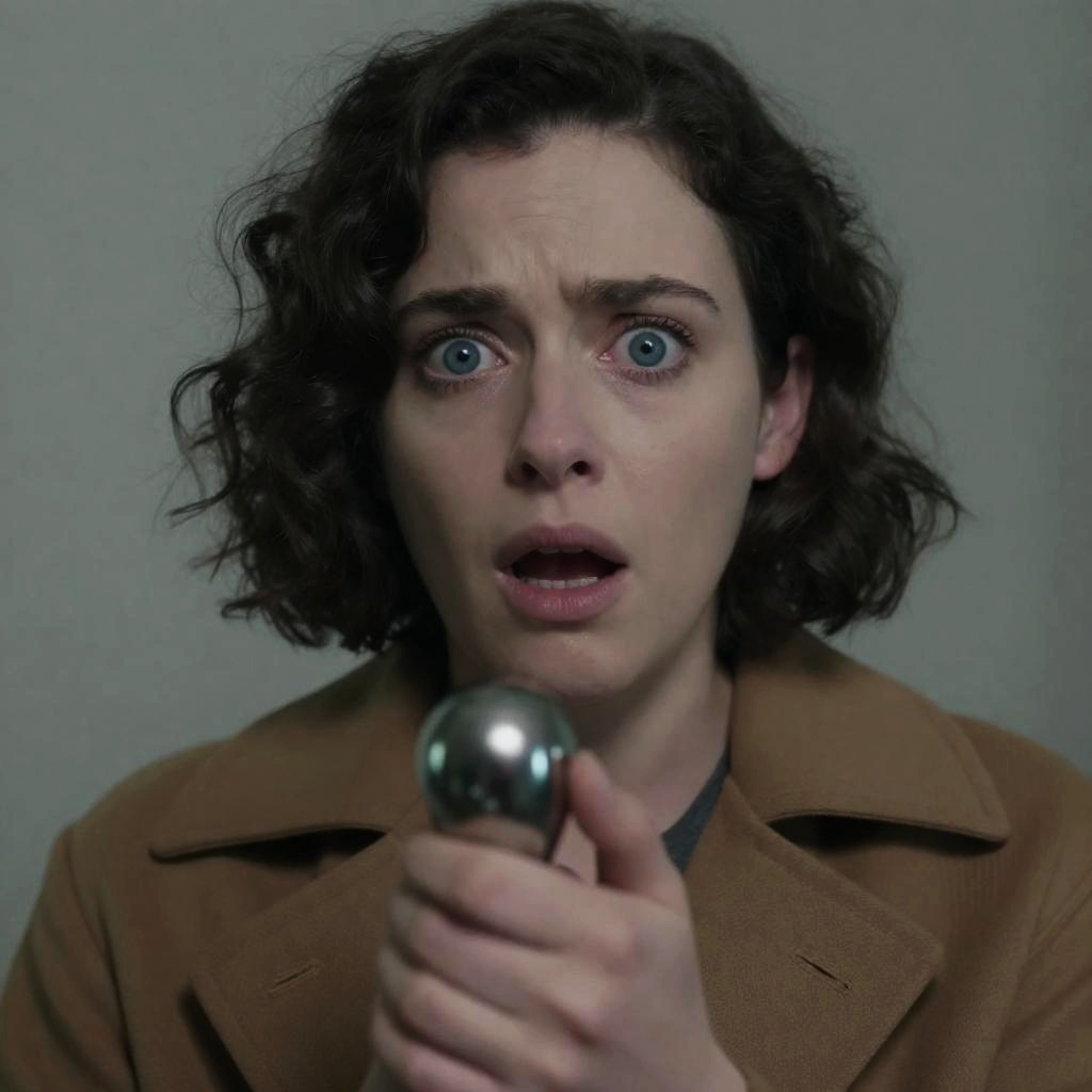 Close-up photograph of a frightened woman with wide blue eyes, short dark curly hair, and open mouth. She holds a large, shiny metal object in her right hand, which is in the foreground. She wears a brown ured coat.