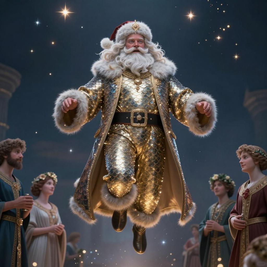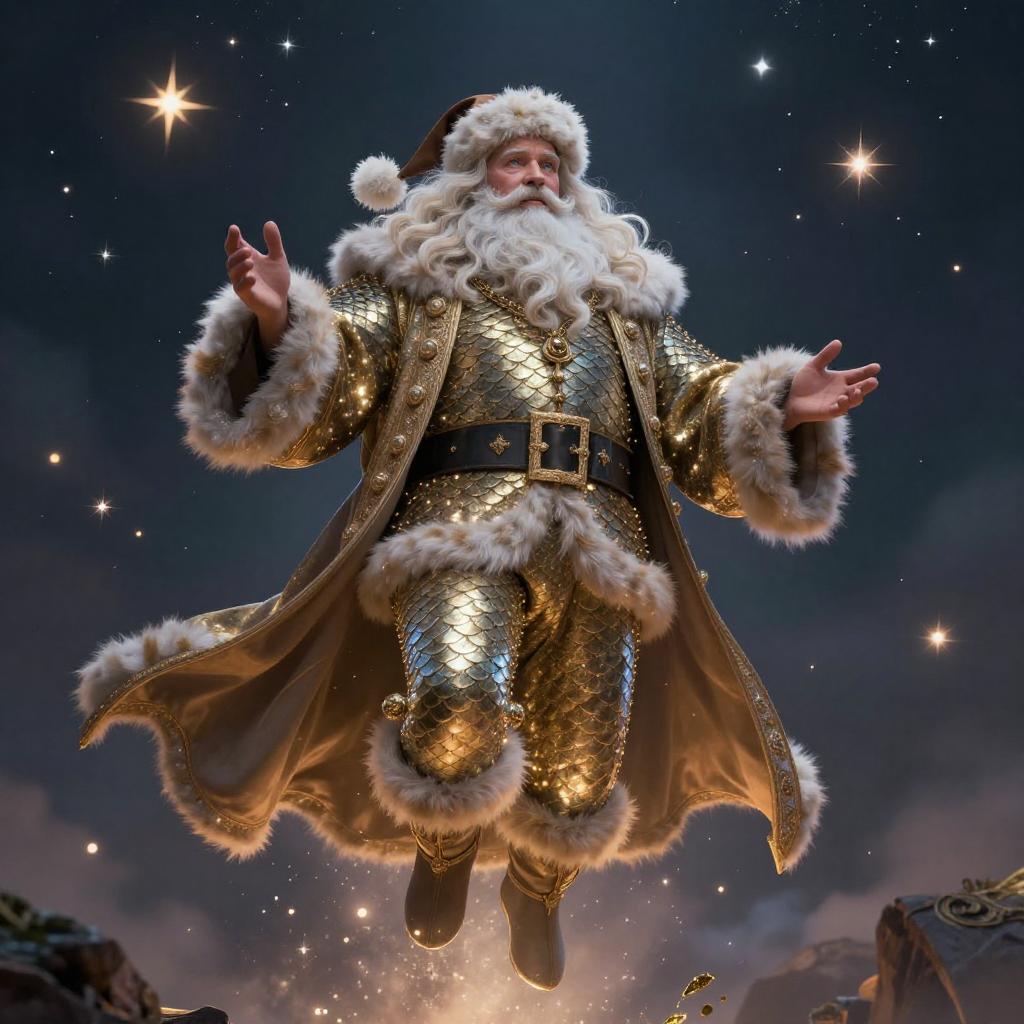 Orna Perfectly-centered portrait-photograph of a real life godly santa with shining scales descending from heaven, stars, lifelike, super highly detailed, professional digital painting, artstation, concept art, Unreal Engine 5, Photorealism, HD quality, 8k resolution, cinema 4d, 3D, beautiful, cinematic, art by artgerm and greg rutkowski and alphonse mucha and loish and WLOP