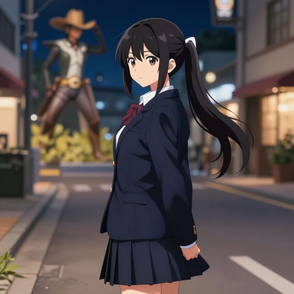 Digital anime-style illustration depicting a nighttime street scene. In the foreground, a young Japanese girl with long black hair tied in a side ponytail, wears a navy blue school blazer and a plaid skirt, standing with her back to the viewer, looking over her shoulder. In the background, a man in a white shirt, brown vest, and cowboy hat rides a dark brown horse. The street is lit by a lamp post and has wooden buildings on either side. The girl's white bow and the man's confident pose contrast with the dim, serene setting.