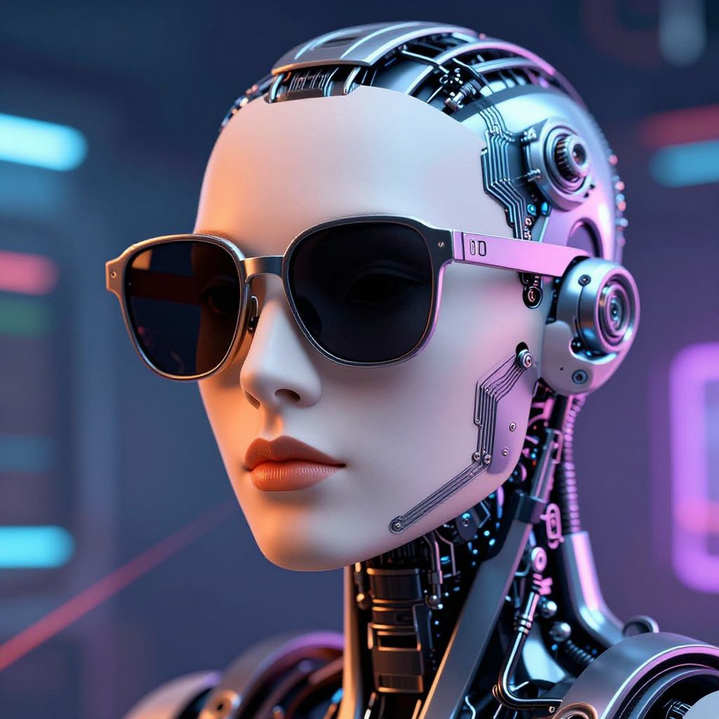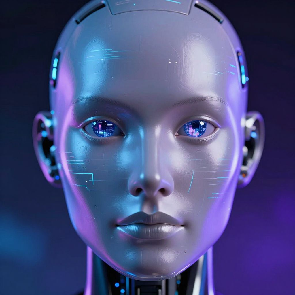 Close-up of bald AI filter on a humanoid robot face, metallic textures with subtle digital glitches, futuristic cityscape reflection in eyes, dark background with vibrant blue and purple hues