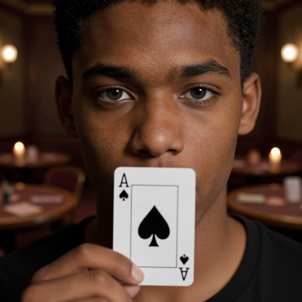 Close-up photograph of a young Black man with short curly hair, holding an Ace of Spades card in a dimly lit, candle-lit restaurant