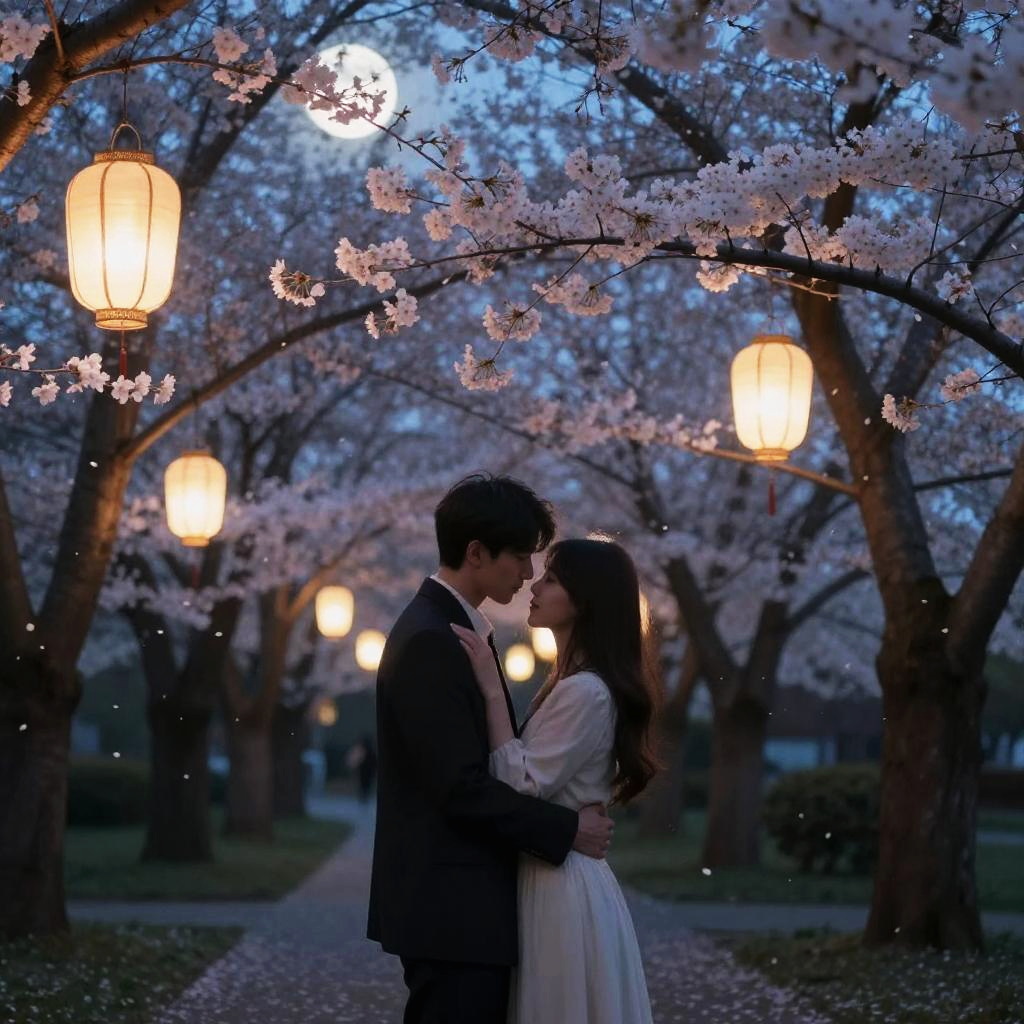 A_romantic_tale set in a moonlit garden, soft glowing lanterns hanging from trees, couple embracing gently under blooming cherry blossoms, delicate petals falling around, dreamy atmosphere