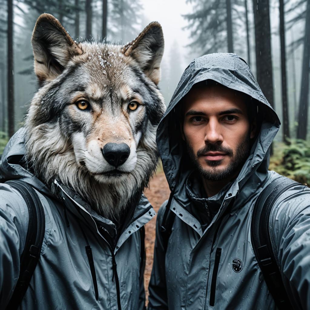 Scroll keeping the closest face to the camera from uploaded picture, dressed in a casual hoodie. Create 8k photo selfie with a red panda. Lion and model will be close but both faces will be visible. Dramatic bamboo forest scenery in the background. High detail lots of hidden detail,