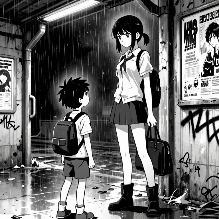 In this black-and-white anime manga panel, a young boy with spiky hair and a backpack stands on the left, facing a tall, slender girl with short hair and a ponytail. The girl, dressed in a short skirt, blouse, and boots, holds a bag in her hand. They are in a dimly lit, ruined subway station, with raindrops visible in the air, suggesting a stormy atmosphere. The walls are adorned with posters and graffiti, adding to the urban, gritty feel of the scene. The boy and girl are positioned close to each other, with the girl slightly in front of the boy, creating a sense of interaction between them. The overall composition is dynamic, with the rain and the characters' postures adding a sense of movement and tension to the scene.