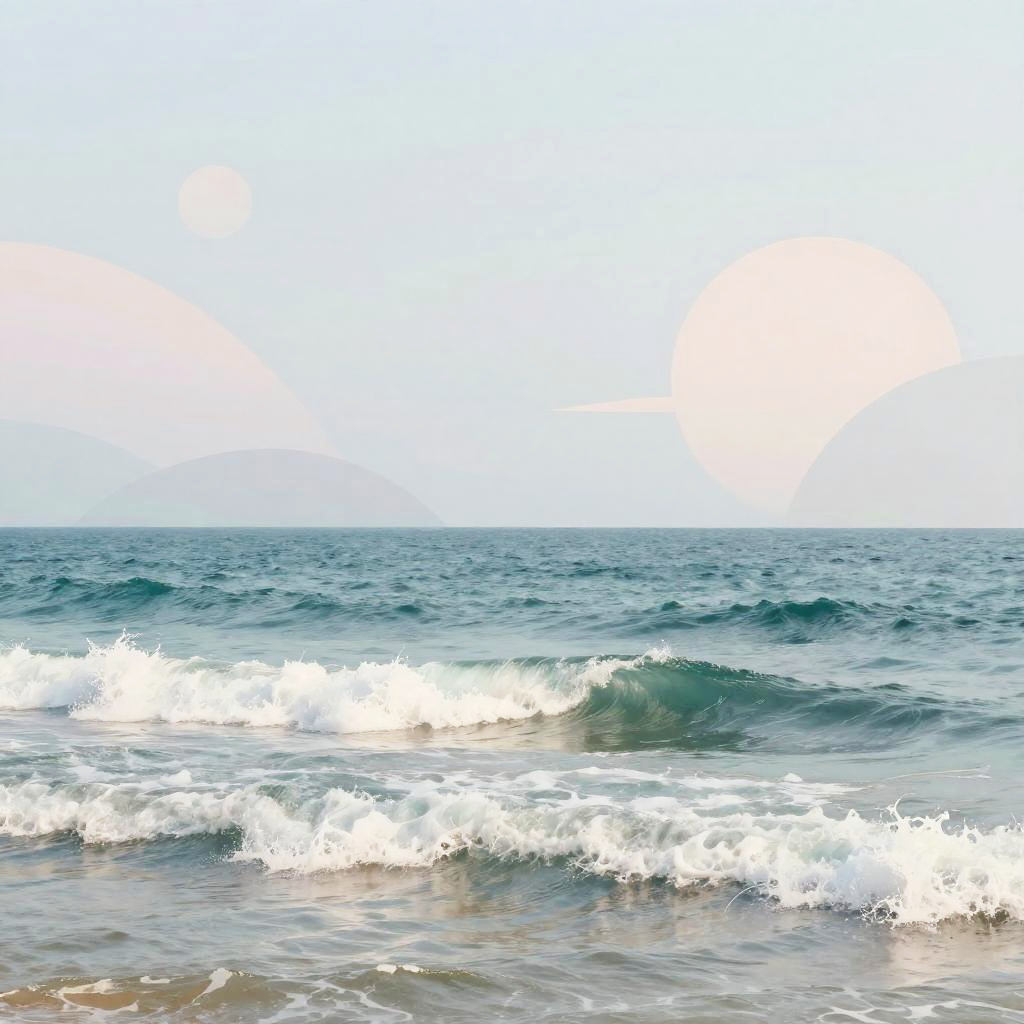 Sea AI art portraying a peaceful coastal landscape transformed by AI-generated patterns on the waves, integrating abstract geometric shapes with natural sea elements, soft pastel hues reflecting a dreamy, ethereal mood, combining classical seascape with modern digital art.