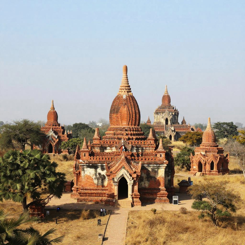 Sunlit Ancient Temple Complex with Stupas