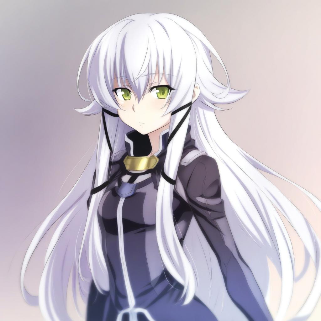 Digital illustration of an anime girl with very long white hair and green eyes. She wears a dark futuristic outfit with white accents and a high collar, featuring a metallic gold accessory on the neck. The character has sidelocks and hair flaps framing her face. The background is softly blurred in neutral tones.