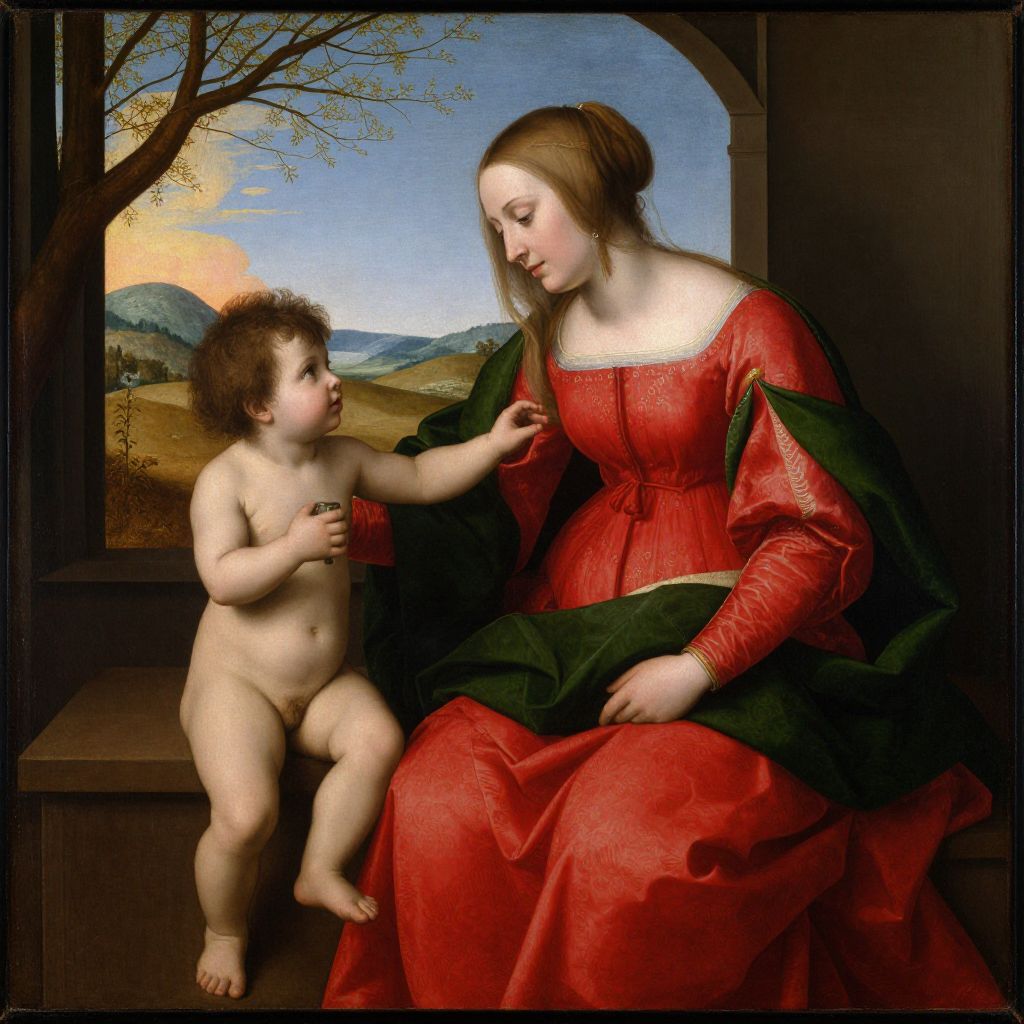 Stephan Lochner's Annunciation oil painting depicts a tender scene where a woman, adorned in a vibrant red dress with a dark green cloak, sits beside a nude child, her hand gently resting on his shoulder as he clutches a small object. The background reveals a serene landscape with rolling hills and a soft sunset, framed by a dark interior setting that contrasts with the luminous figures.