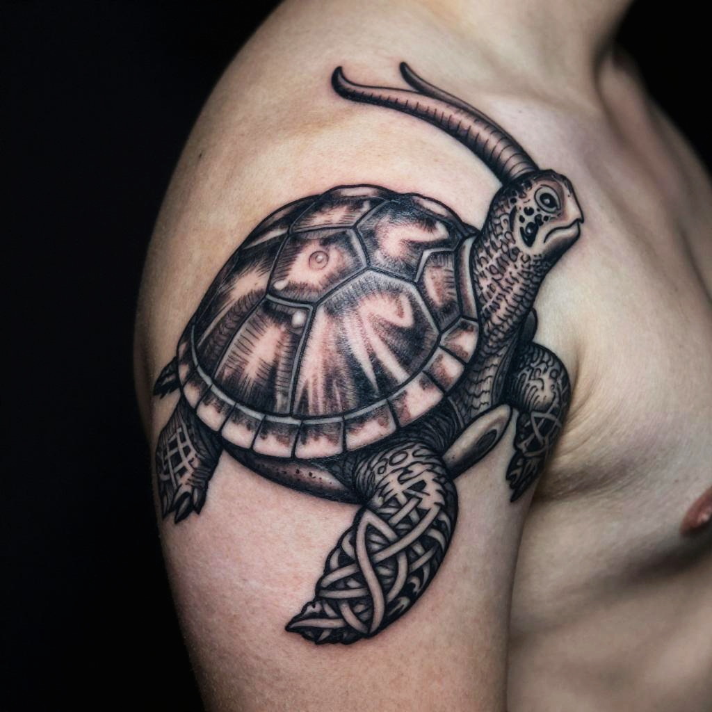 Viking turtle tattoo, fusion of Viking art and turtle symbols, Celtic-style knot decorations on turtle shell, strong warrior aura, monochrome design with fine details