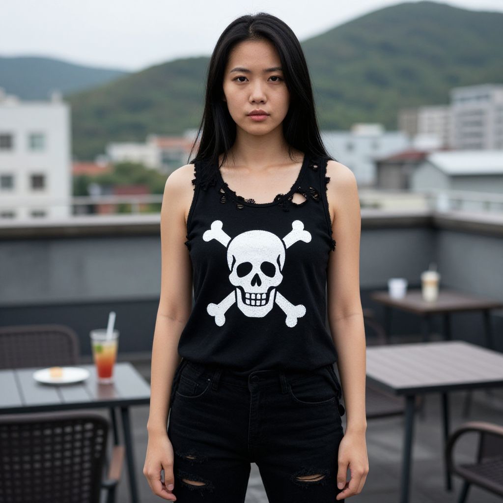 Photograph of an Asian woman with long black hair standing on a rooftop. She wears a black, ripped tank top with a white skull and crossbones design, and distressed black jeans. She has a neutral expression and is looking directly at the camera. In the background, there are blurred buildings and green hills. Tables with drinks and plates are scattered around the rooftop.