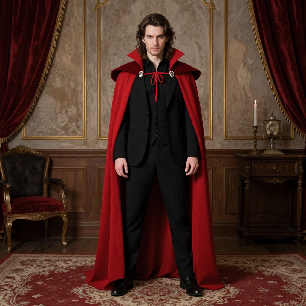 Photograph of a man with long dark hair, wearing a black suit and red velvet cape, standing in an ornate, vintage room with dark wood
