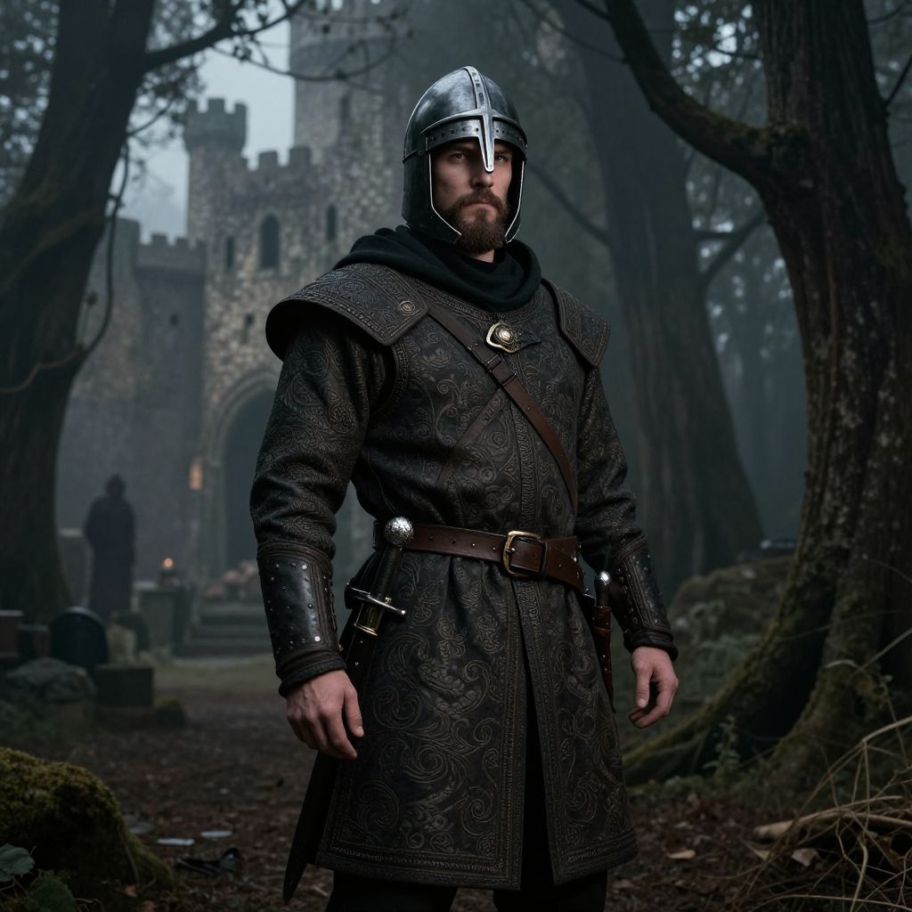 A man with a beard and mustache is wearing a medieval costume with a helmet and a sword. He is standing in a medieval-themed forest, with tall trees and a castle in the distance. The atmosphere is dark and mysterious, with a foggy ambiance. The man's clothing is well-fitted and detailed, with intricate patterns and armor. The scene is illuminated by a dim, eerie light, creating a dramatic and immersive environment.