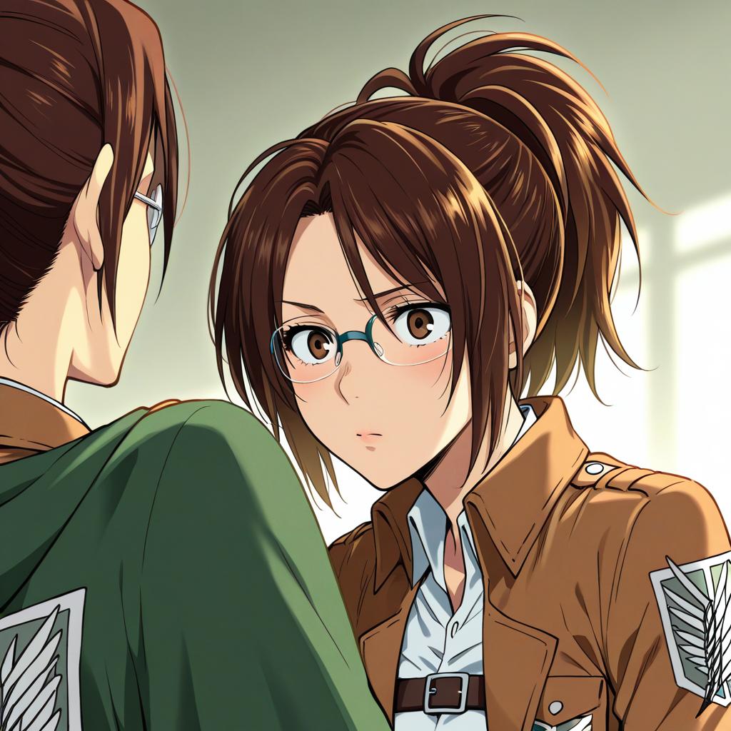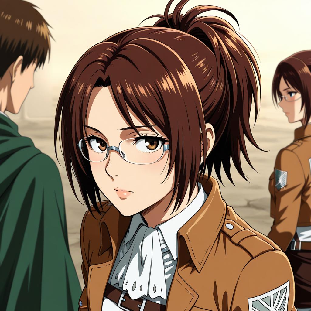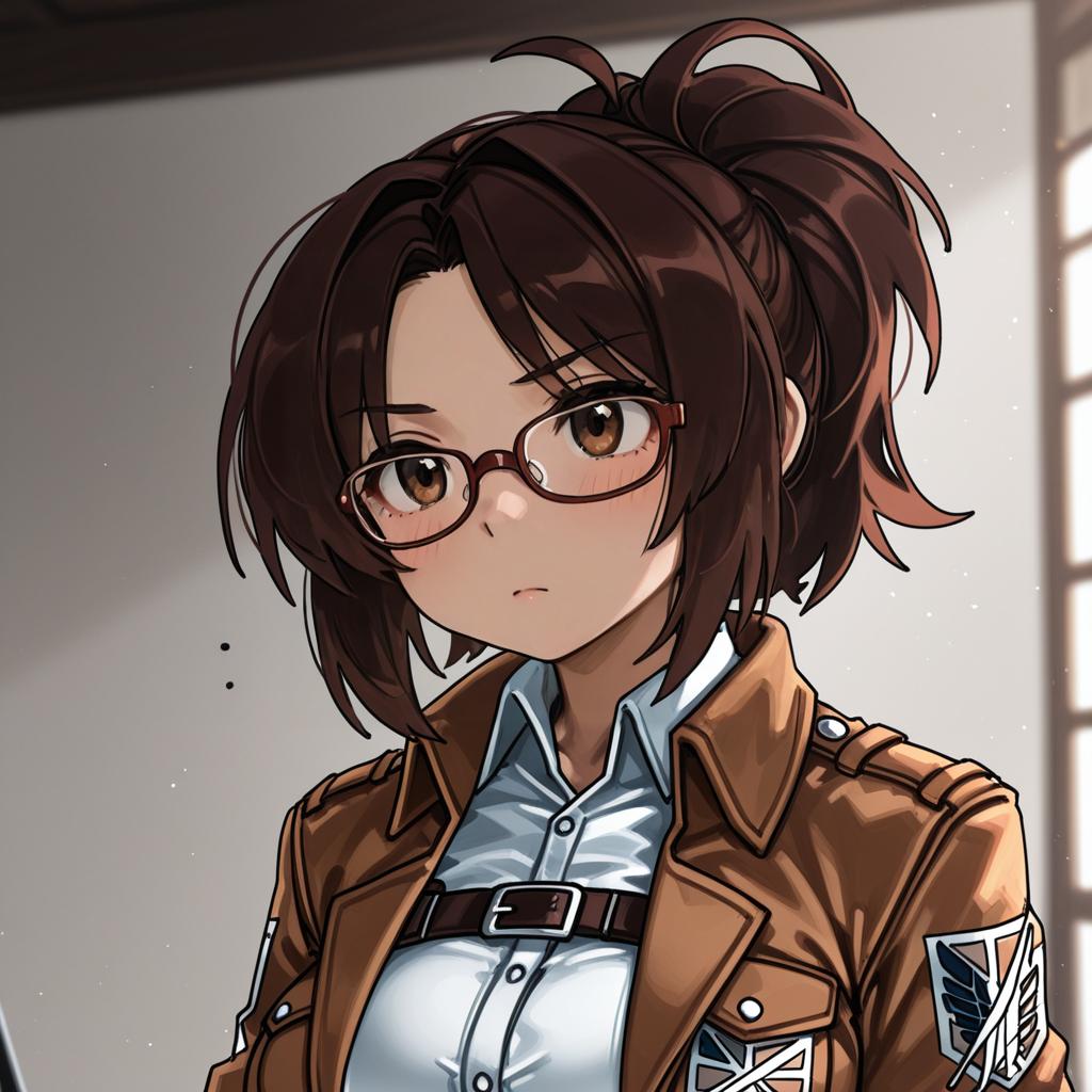 Hange zoe, shingeki no kyojin, 1girl, brown eyes, glasses, brown hair, short hair, ponytail, paradis military uniform, by artist hakai shin, illustrious
