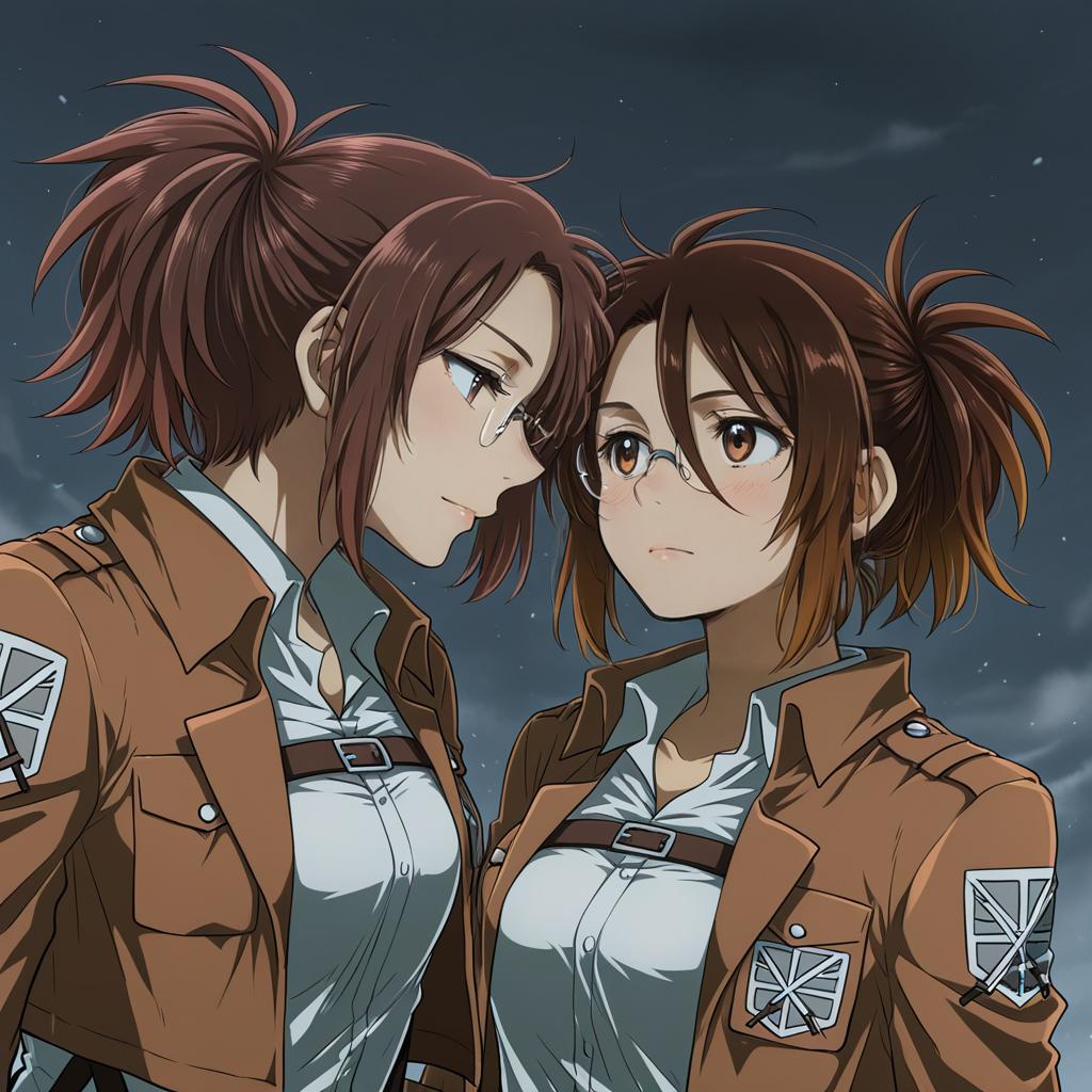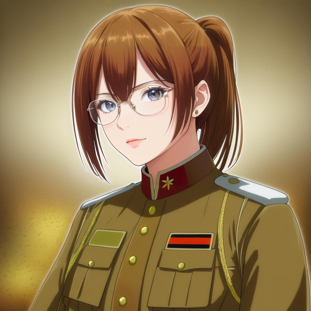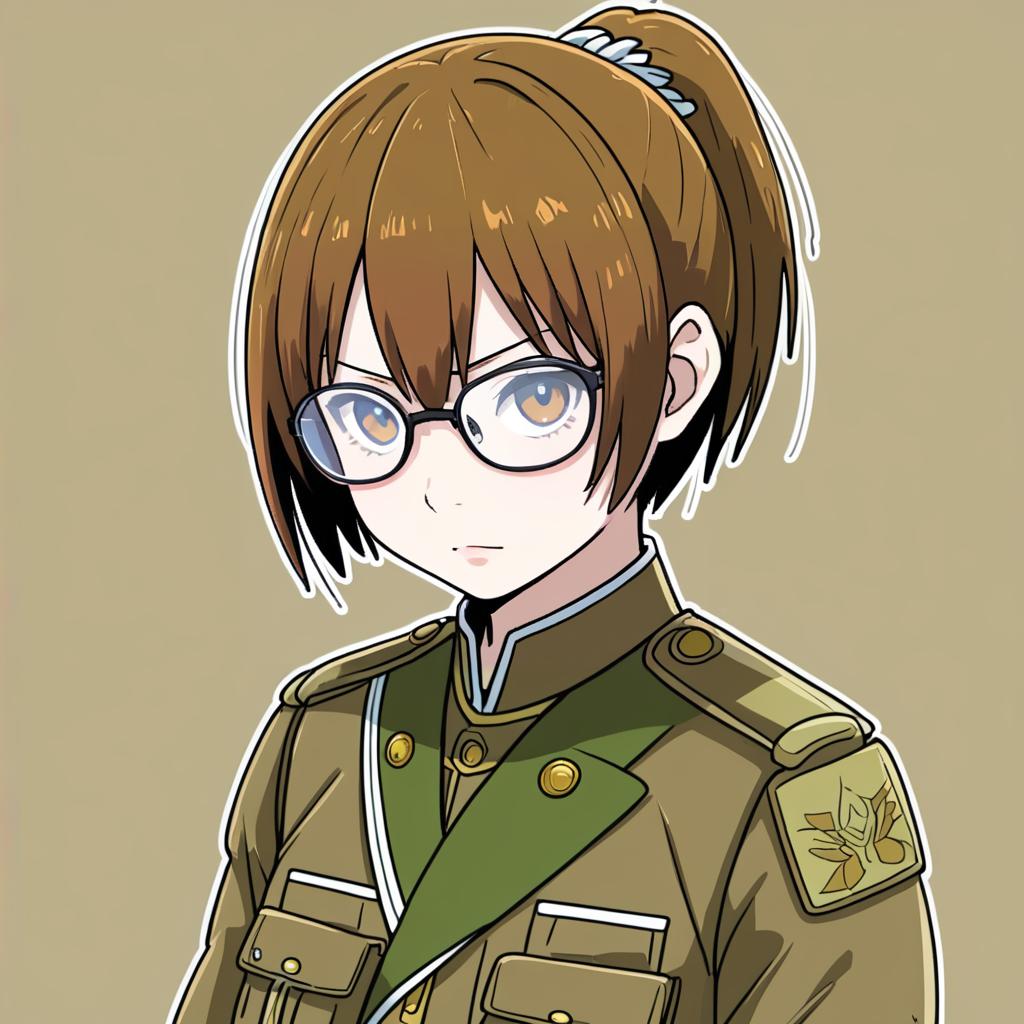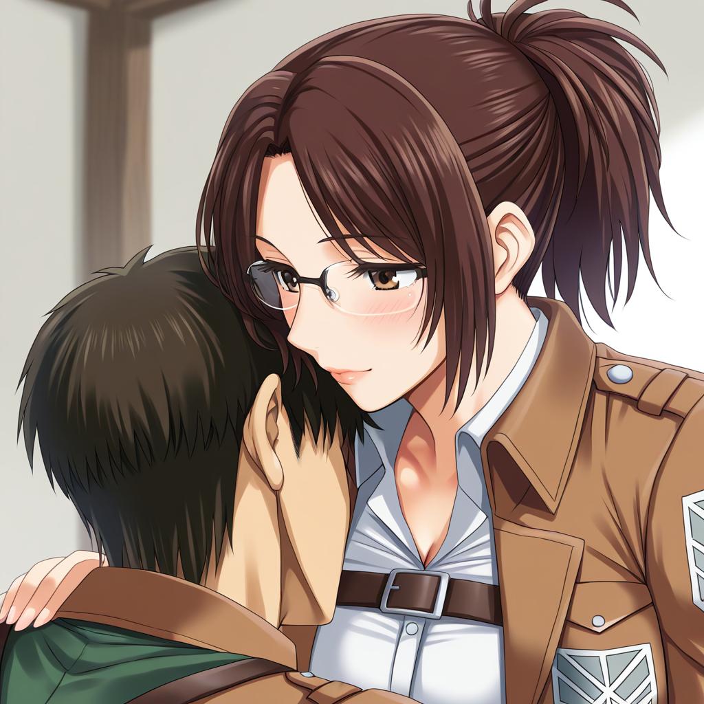 Hange zoe, shingeki no kyojin, 1girl, brown eyes, glasses, brown hair, short hair, ponytail, paradis military uniform, by artist hakai shin, illustrious