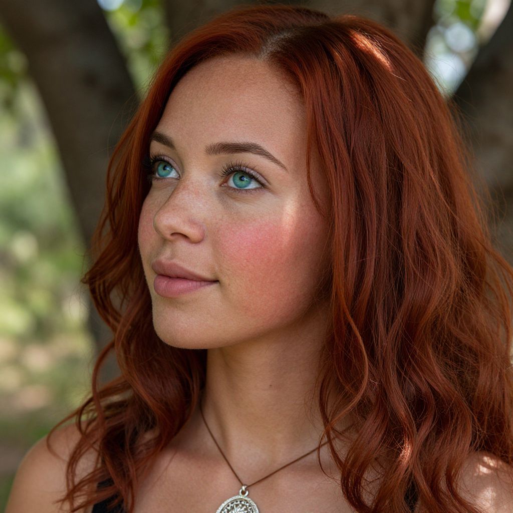 Envision an intimate portrait of a Sub-Saharan African woman with mesmerizing blue-green eyes and vibrant red hair cascading in gentle waves around her shoulders. The unique angle showcases her profile from above, highlighting a delicate silver pendant adorning her neck. Sunlight filters through the surrounding trees, casting dappled shadows on her fair skin, accentuating an enigmatic smile that exudes warmth and mystery. Intricate details of freckles, rosy cheeks, and soft hair texture create a hyperrealistic image, inviting viewers to explore a spectrum of human emotions.