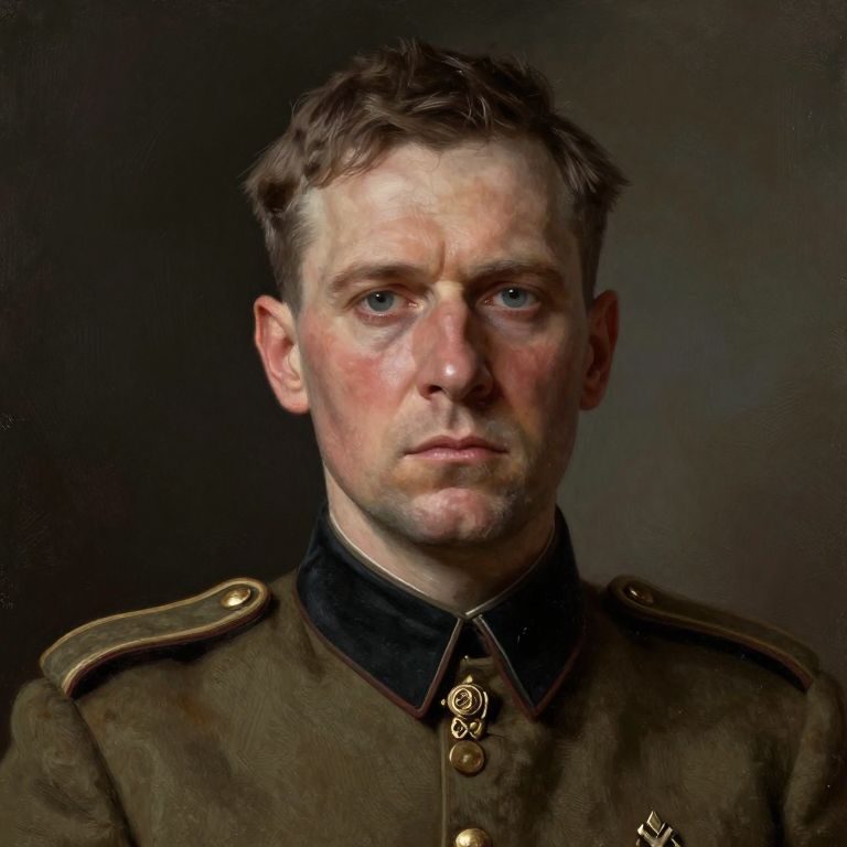 Photorealistic portrait of a serious, blue-eyed Caucasian man with short brown hair, wearing a military uniform with gold epaulettes and black collar