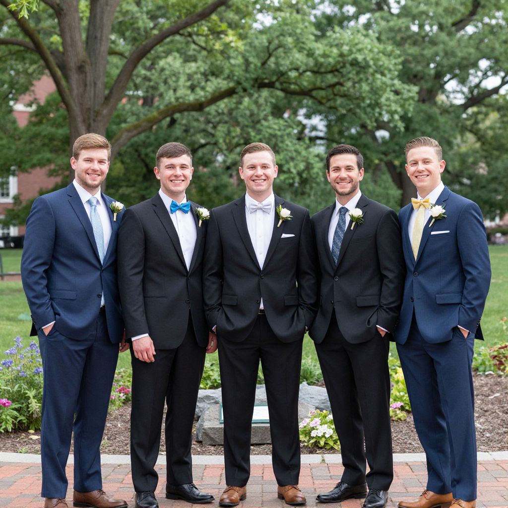 Photograph of five smiling groomsmen in black suits, white shirts, blue bow ties, and boutonnieres, standing on a brick path in