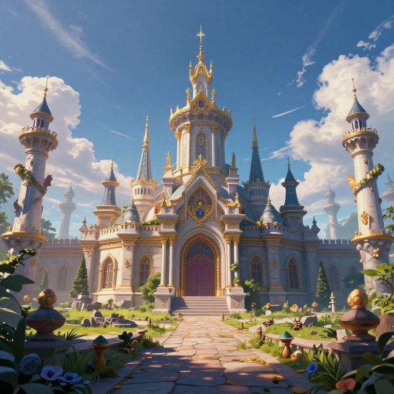 Digital art of a grand, golden castle with multiple turrets and spires, surrounded by lush gardens, under a bright blue sky.