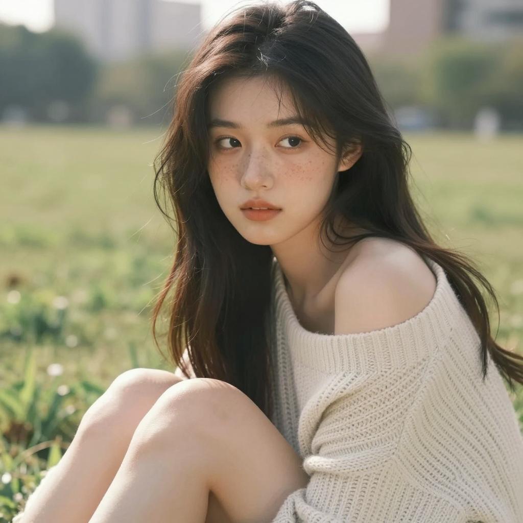 Young woman with wet brown hair in white lace top and pearl necklace in water, looking back over her shoulder. Black inflatable raft in background, surrounded by dimly lit floating candles. Evening light. Several people in water.