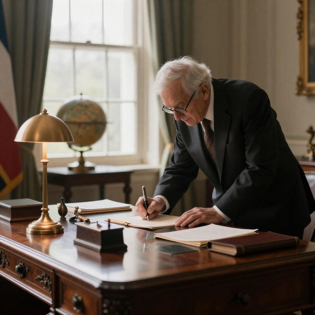Photograph of an elderly man with white hair and glasses, wearing a dark suit, leaning over a large, ornate wooden desk. He is writing on a document with a vintage pen. The desk has a brass lamp, a globe, and a flag. Sunlight streams through a window behind him, illuminating the room.