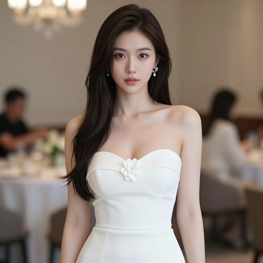 Photograph of an East Asian woman with long, straight black hair standing in a softly lit, elegant dining room. She wears a strapless, white, form-fitting wedding dress with a small bow at the center, and dangles small, silver earrings. Her skin is fair, and she has a neutral expression. The blurred background features round dining tables with white tablecloths, floral centerpieces, and seated guests. A chandelier with warm light hangs from the ceiling. The overall ambiance is sophisticated and romantic.