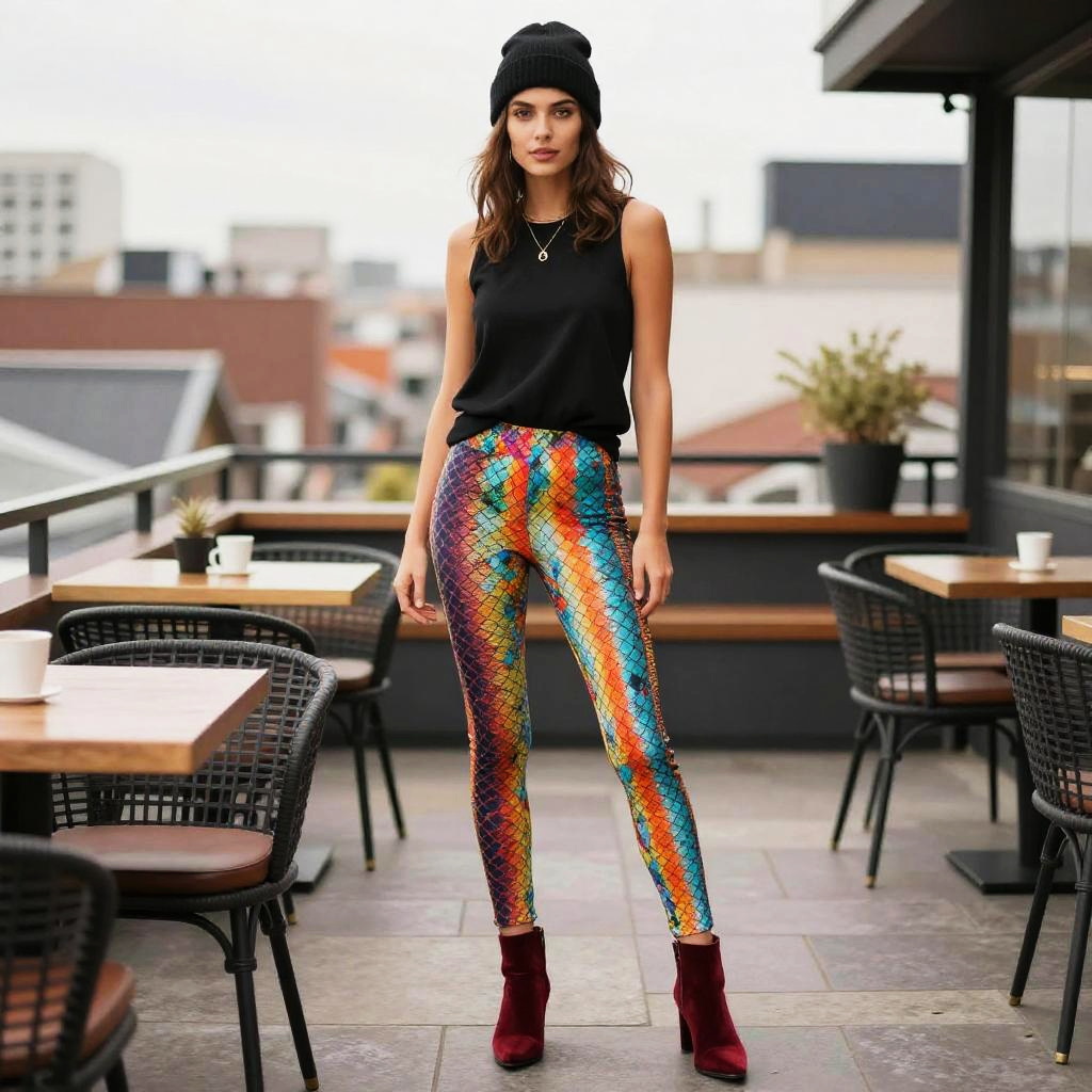 Photograph of a slender, light-skinned woman with long brown hair wearing a black beanie, black sleeveless top, and vibrant, rainbow-colored, sequined leggings. She stands on a rooftop patio with modern black wicker chairs and wooden tables, wearing red ankle boots. The background shows an urban cityscape with blurred buildings. The woman has a confident expression and is centered in the image, with a potted plant and a glass door to her right. The overall style is contemporary urban fashion.