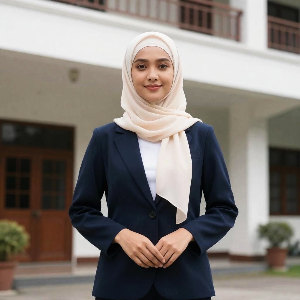 Formal Outfit Hijab, a woman wearing a hijab standing in front of a building