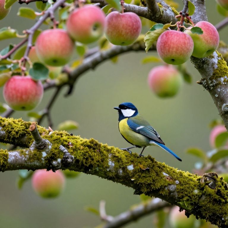 Photograph of a small, vibrant blue and yellow tit bird with a black and white head, perched on a mossy branch. The bird is centered, with its back slightly turned. Surrounding the bird, red and green apples hang from branches in soft focus, creating a natural, autumnal backdrop. The branches and apples are detailed, with the moss adding texture to the branch. The background is a blurred mix of green and brown, emphasizing the bird and apples. The overall composition is balanced and colorful, highlighting the bird amidst a fruitful orchard setting.