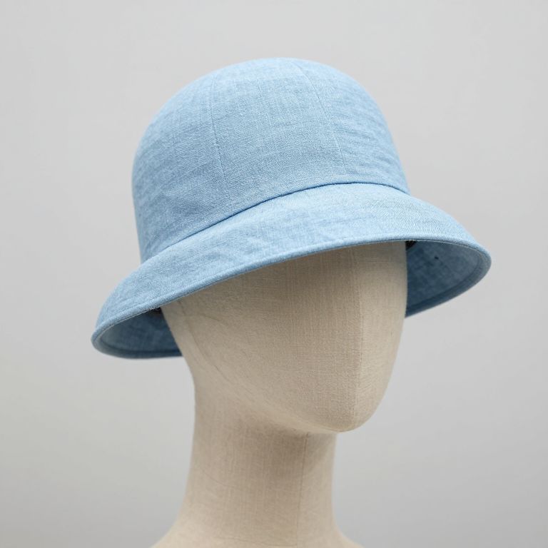 Ice-blue linen cloche hat displayed on a mannequin head, showcasing its vintage 1920s style with a wide brim and structured crown.