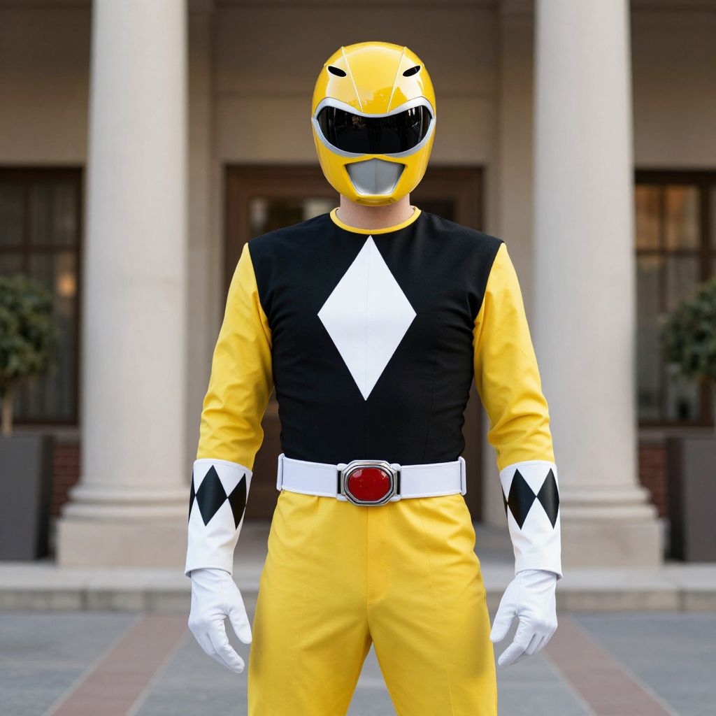 "Yellow Ranger Halloween, man in a yellow and black costume standing in front of a building"