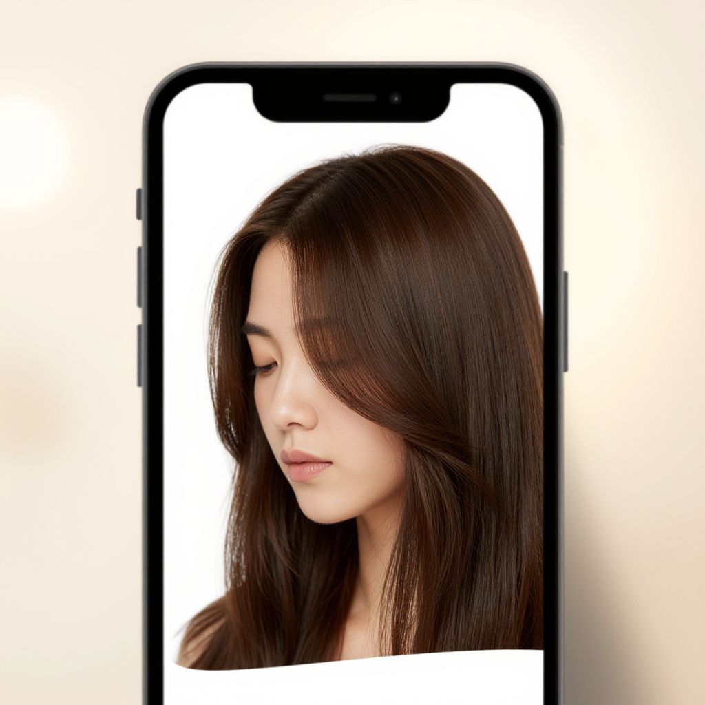 Photograph of an Asian woman with long brown hair, wearing a white shirt, being styled by hands holding her hair, reflected in a smartphone screen.