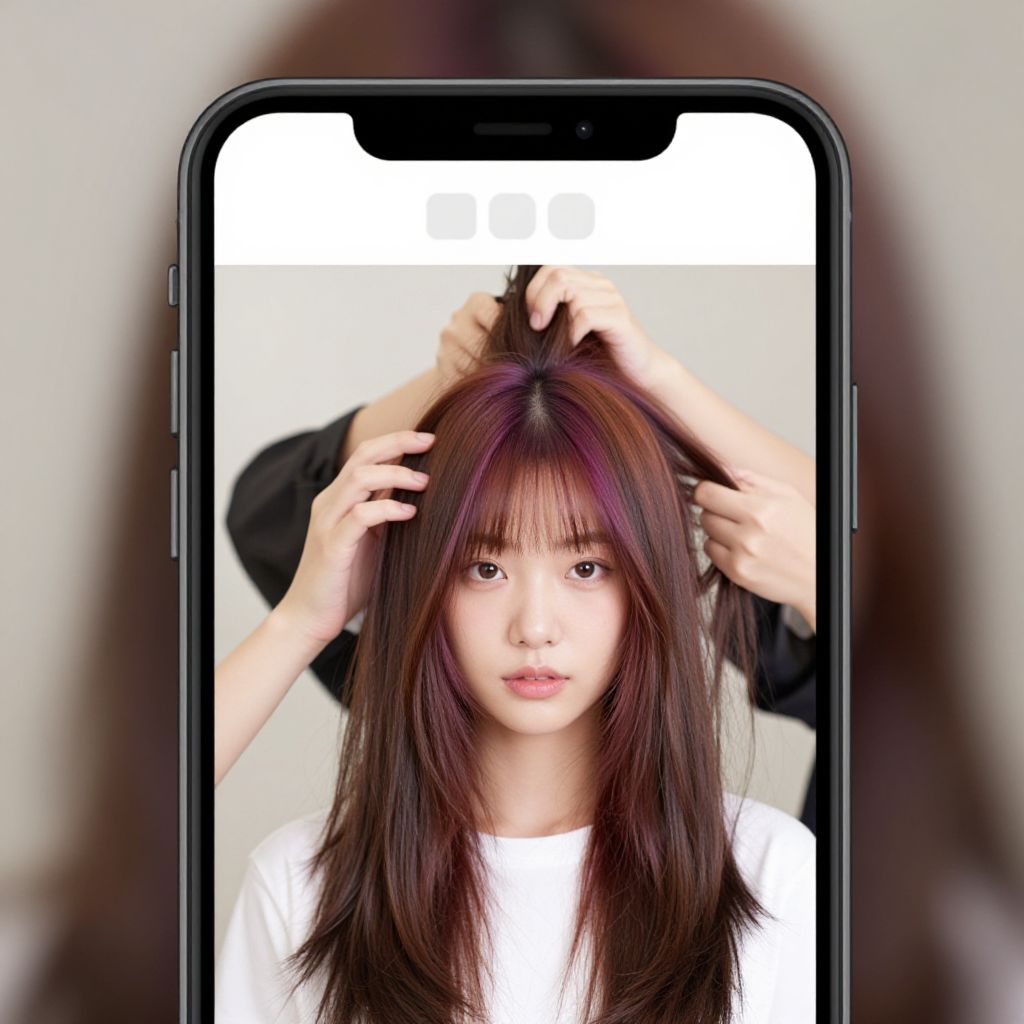 Hair style try on app display featuring a young woman experimenting with different haircuts and colors in real-time, augmented reality overlay, crisp modern smartphone design, soft lighting, vivid hair textures, lively and engaging digital beauty transformation.