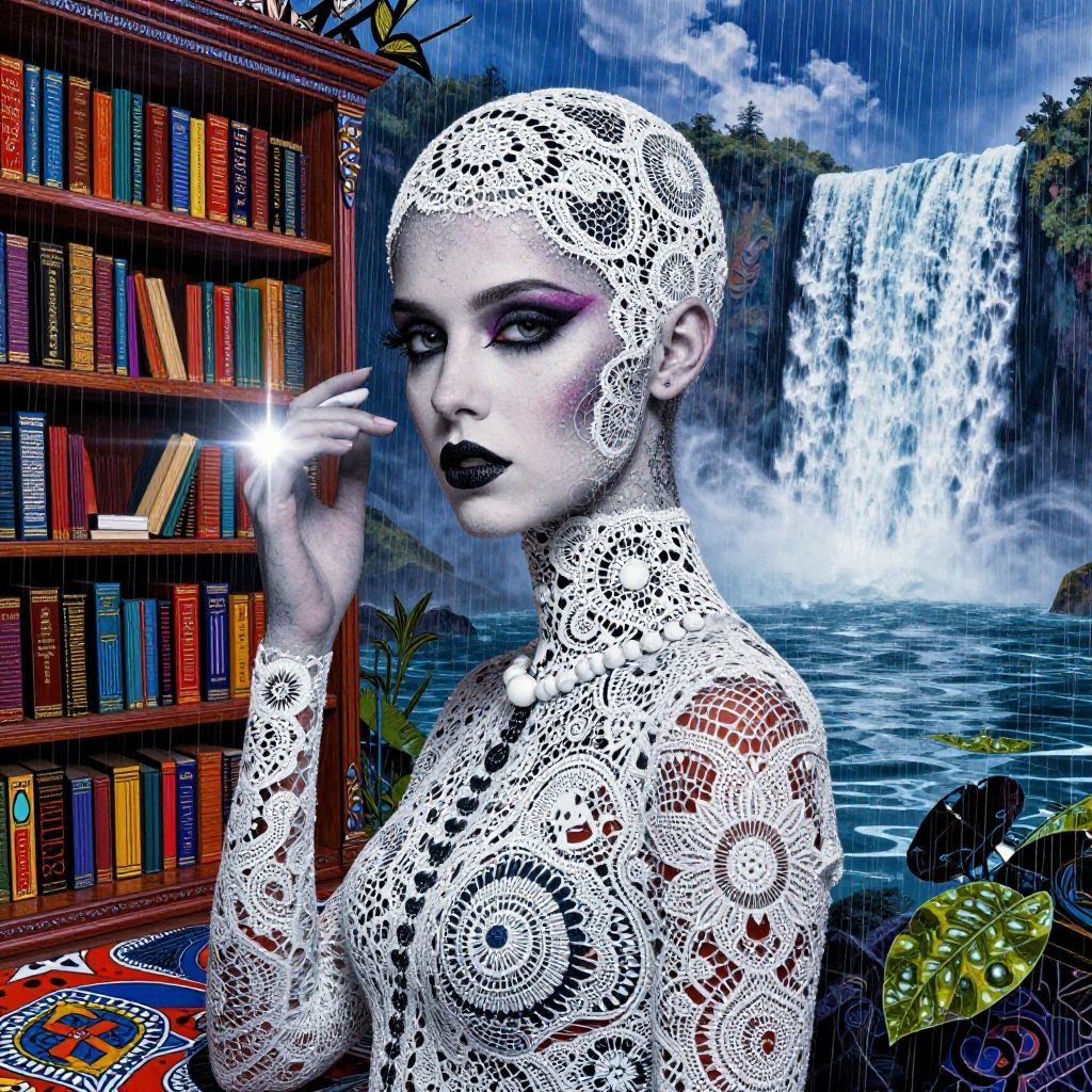 This digital artwork depicts a pale-skinned woman with a bald head, dressed in an intricate white lace bodysuit adorned with black floral patterns. She has bold black lipstick and dark eye makeup, with one hand raised to her face, holding a spark. She stands in front of a wooden bookshelf filled with colorful books. The background features a vibrant waterfall cascading into a serene blue river, surrounded by lush greenery. The image is highly stylized with a surreal, vibrant color palette and a mix of realistic and fantasy elements, blending nature with a mysterious, ethereal figure.