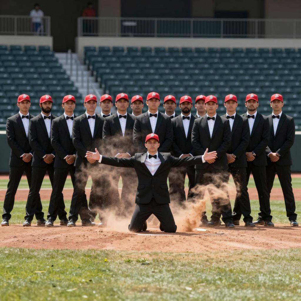 Group of 21 men wearing black tuxedos, white shirts, black bow ties, and red baseball caps standing on a baseball field. One man kneels in the front middle with arms outstretched, kicking up dust, while the others stand behind him in a formal pose. The background includes empty stadium seats under sunlight, creating a striking contrast between formal wear and the sports setting.