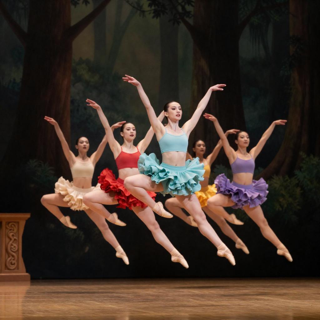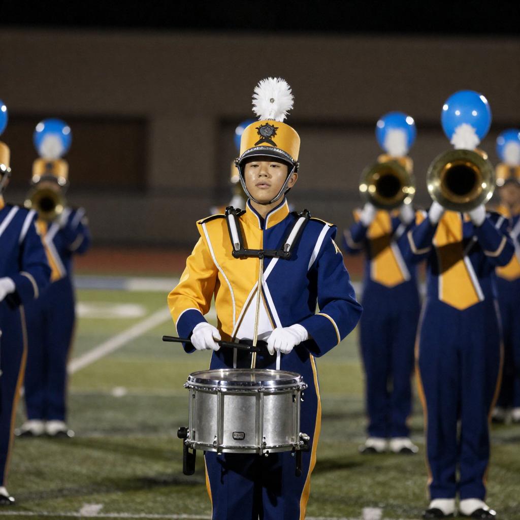 Photograph of a nighttime performance featuring a line of female dancers in blue sequined tops and pants, mid-dance with arms raised. They are accompanied by a brass band in yellow uniforms playing instruments. The dancers' midriffs are exposed, and the background shows dimly lit buildings. The dancers' poses and the band's music create a dynamic, synchronized scene.