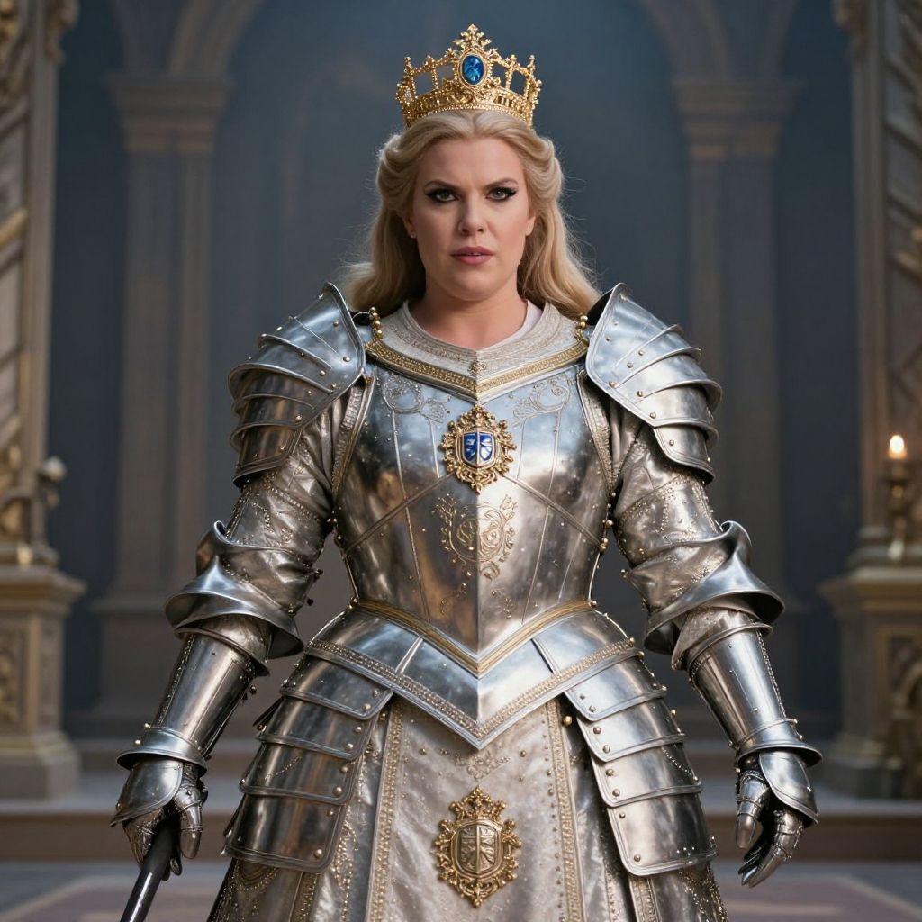 Digital art of a blonde woman with a crown, wearing ornate silver armor with gold emblems, standing in a grand, dimly lit hall.