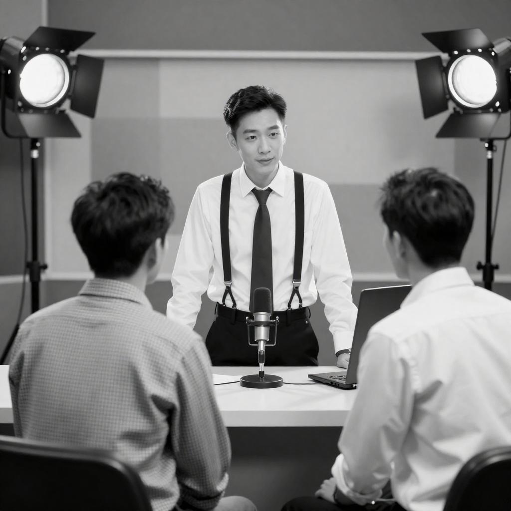 Black-and-white photograph of three men in a studio. One man stands behind a desk with a microphone, wearing a white shirt, black tie, and suspenders. Two seated men, one in a checkered shirt and the other in a white shirt, face him. Background features a patterned wall and studio lights.