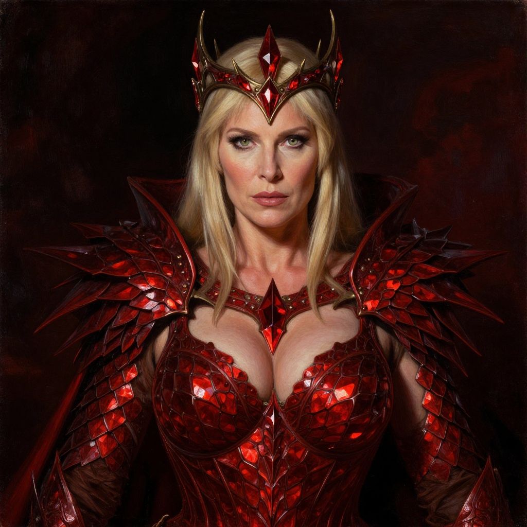 Photograph of a blonde, blue-eyed woman with fair skin, wearing elaborate, red, reflective, armor-like attire with large, pointed shoulder plates and a matching crown. Her armor features intricate, scale-like patterns and highlights her large breasts. She has a confident, intense expression with slightly parted lips. The background is dark, creating a stark contrast that emphasizes her bright armor and striking features. The lighting focuses on her upper body, enhancing the glossy texture of the armor. The overall style is fantasy-themed, evoking a powerful, regal warrior queen.