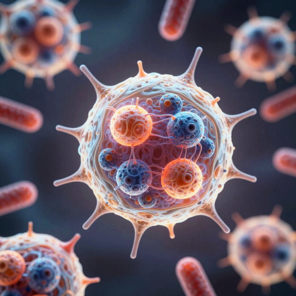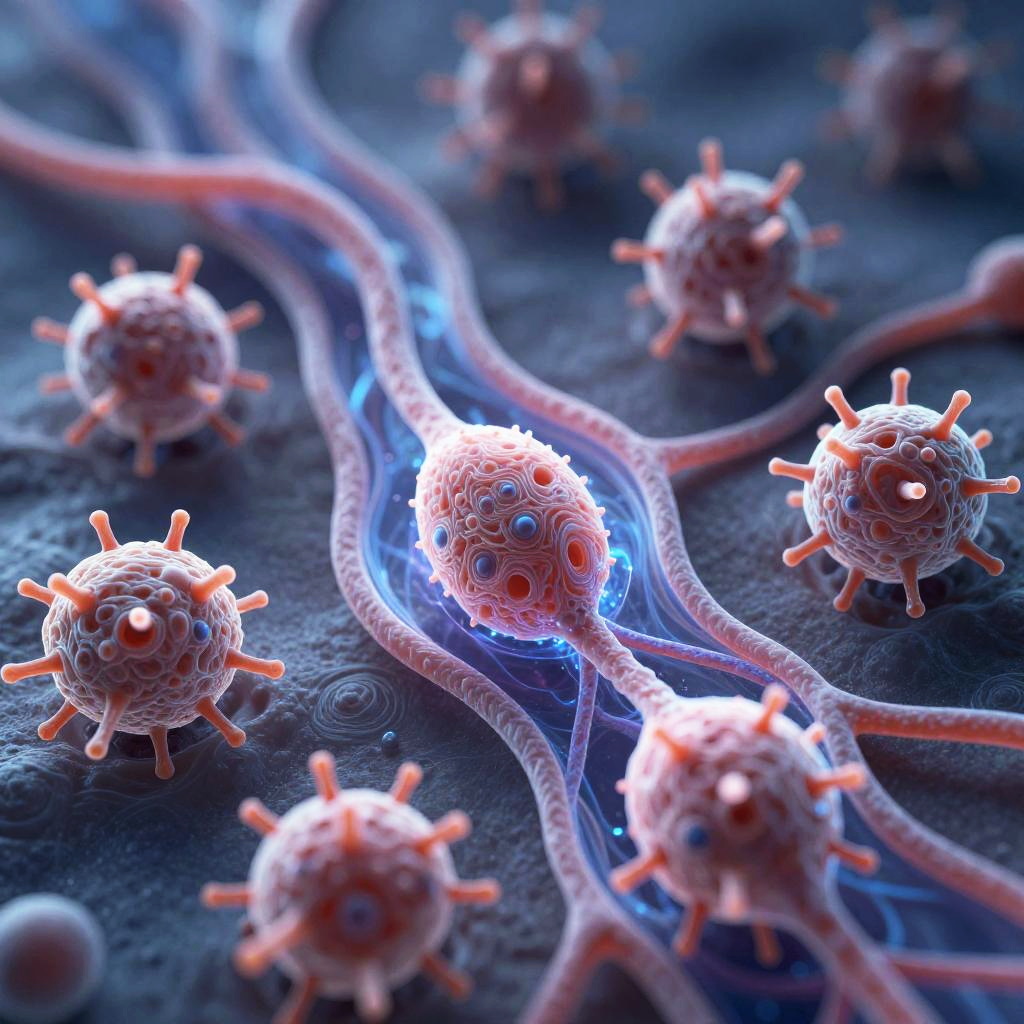 Vesicles inside a futuristic biological cell, depicted in neon colors, floating in a dynamic cytoplasmic landscape, surrounded by mitochondria and endoplasmic reticulum, digital art with glowing effects and fluid organic forms, highly detailed microscopy style.