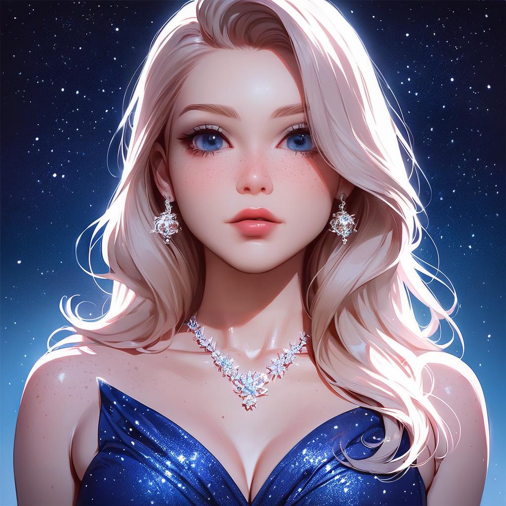 Digital artwork of a young woman with long red hair, freckled smooth skin, and warm brown eyes. She features prominent collarbones, subtle moles including one under her mouth, and parted lips. The subject wears a shimmering blue silk gown with off-shoulder sleeves and crystal drop earrings. The background depicts a starry night sky, adding a mystical atmosphere to the portrait.
