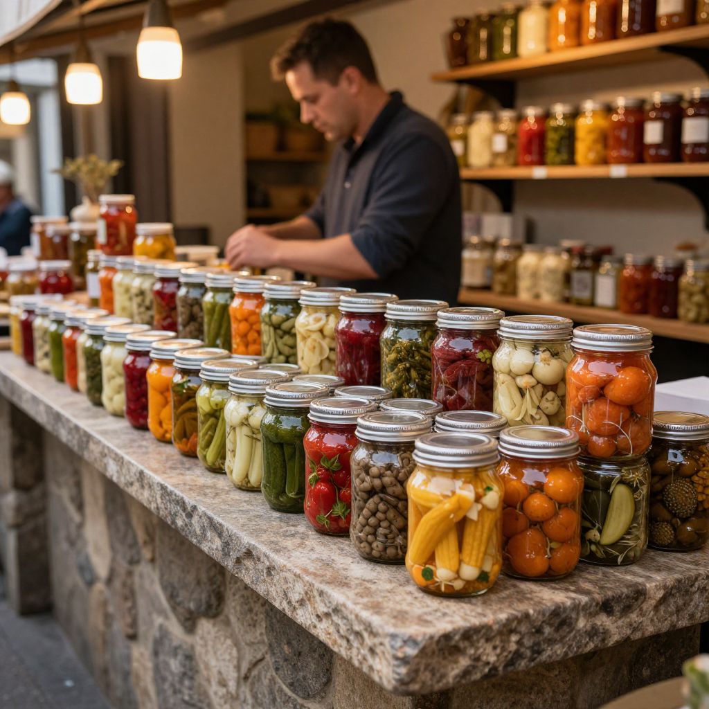 Rows of meticulously arranged glass jars filled with vibrant pickled vegetables line a rustic stone countertop, while a man in a dark shirt tends to them, surrounded by warm ambient lighting and shelves stocked with additional preserves in a cozy market setting.