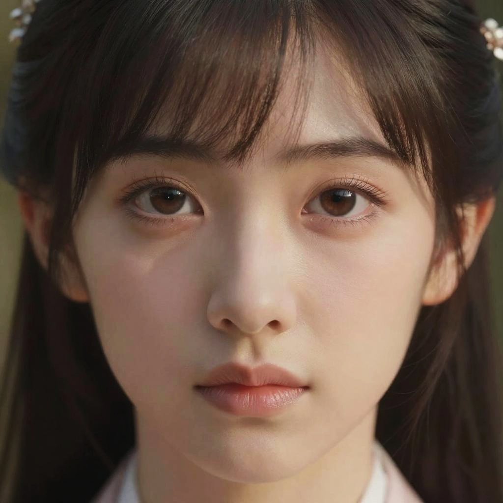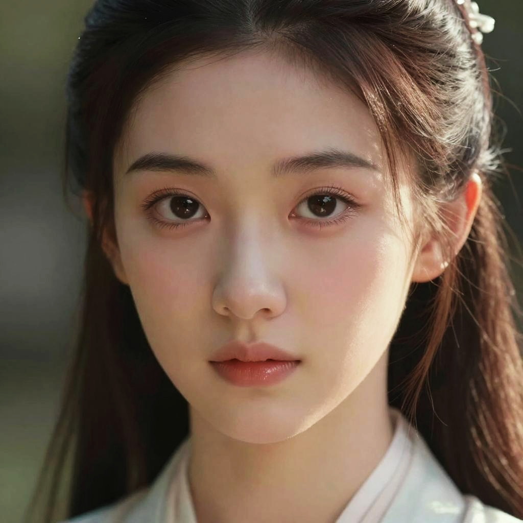 This is a close-up photograph of an East Asian woman with fair skin and large, dark brown eyes. She has straight, dark brown hair with bangs that slightly cover her forehead. Her expression is neutral, with slightly parted lips. She wears a white top, and the background is blurred, focusing attention on her face. The lighting is soft, highlighting her smooth skin and subtle makeup. The image has a realistic, slightly enhanced quality, typical of modern portrait photography.
