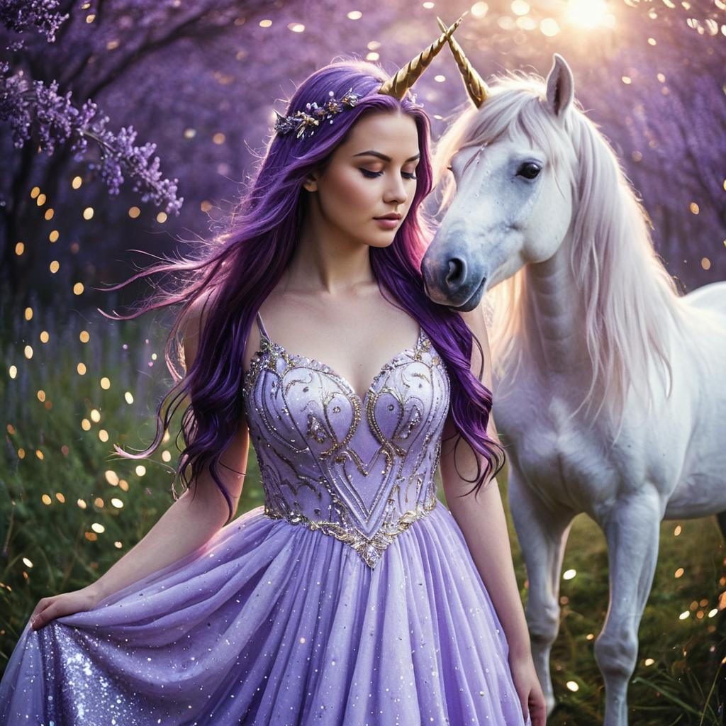 Purple unicorn dress, digital art, realistic style, young woman with long purple hair, standing in front of a unicorn, wearing a sparkling lavender dress, soft light, magical atmosphere, purple and white color palette, unicorn with a golden horn, fairy tale aesthetic, ethereal background with sparkles, gentle expression on woman's face, soft lighting, fantasy theme, high detail, fantasy character design, magical realism, ornate dress, elegant and graceful, mystical setting, other unicorn partially visible in background