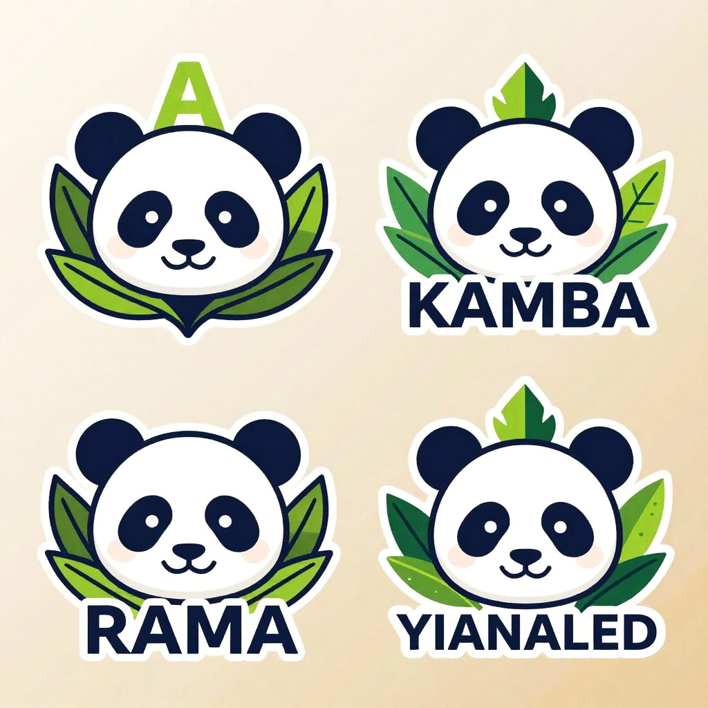 This image is a digital artwork featuring four separate logos, each with a panda face at the center. The pandas are surrounded by green leafy designs. The top-left logo has "A" in bold letters, the top-right has "KAMBA" in bold letters, the bottom-left has "RAMA" in bold letters, and the bottom-right has "YIANALED" in bold letters. The background is a gradient from beige to light brown.