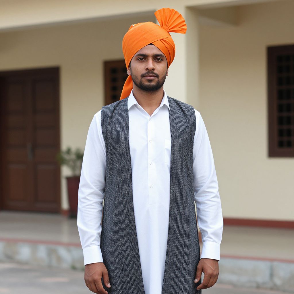 Photograph of a young South Asian man standing outdoors in front of a cream-colored building with dark brown doors and windows. He has a medium brown complexion, a trimmed beard, and wears a bright orange turban with a large, folded top. He is dressed in a white long-sleeved shirt and a gray, textured vest. His expression is serious, and he stands with his arms relaxed at his sides. The background includes a small potted plant near the building's left door. The overall style is traditional Pakistani attire, and the image has a slight blur effect.